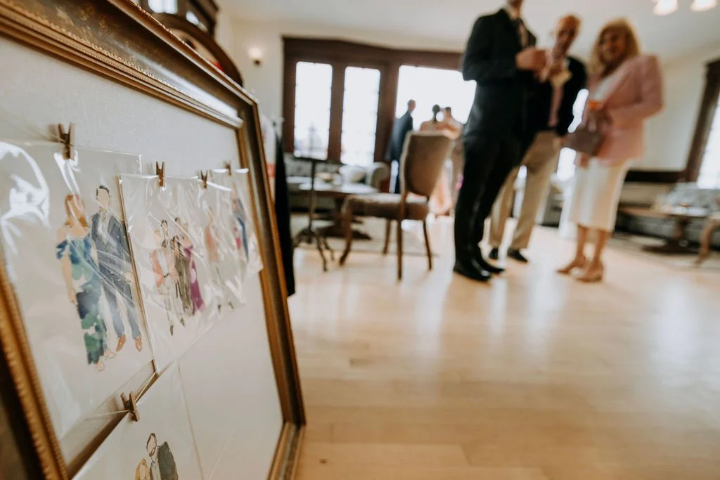 My live watercolor guest portraits are drawn 100% by hand (no AI), pulling from my years of experience and formal training in figure drawing. Each guest’s unique character and posture is sketched in pen then brought to life with a wash of watercolor.