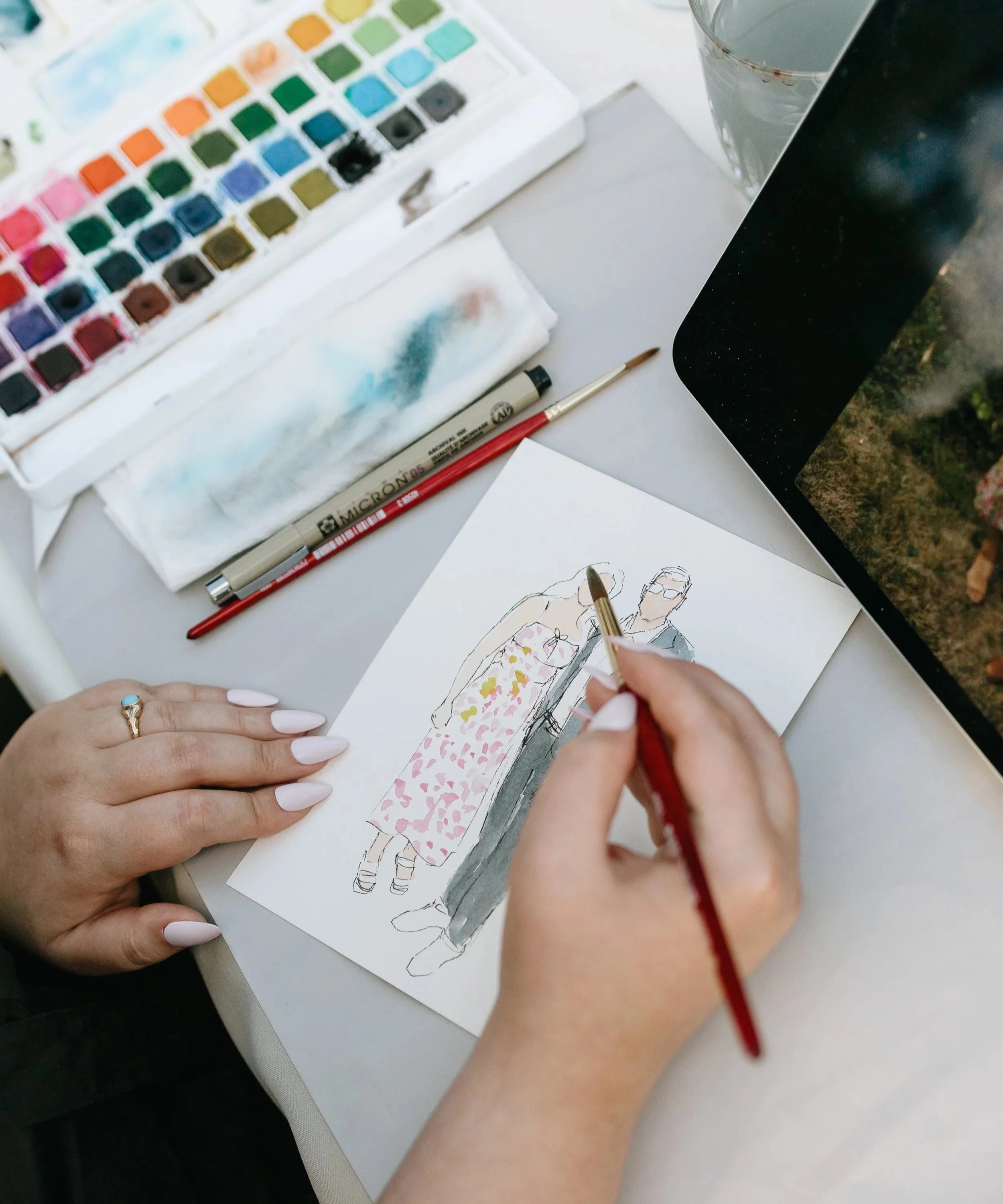 During cocktail hour and the reception, my husband helps guests sign up and takes reference photos, which he sends directly to my iPad while I paint on site. I can typically paint one person in about 6–8 minutes, which allows me to create a steady flow of portraits throughout the evening. Each portrait is painted fully by hand on 5×7” archival watercolor paper using ink and watercolor, with the guest’s name written on the back. Finished portraits are placed in protective sleeves so guests can take them home.